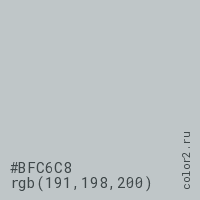 Цвет #BFC6C8 в цветовой модели RGB обозначается тремя октетами (191, 198, 200) в десятичном формате и #BFC6C8 в шестнадцатиричном (hex) формате, которые являются интенсивностью красного 191 (hex BF), интенсивность зелёного 198 (hex C6) и интенсивность синего 200 (hex C8).