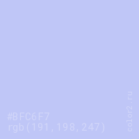 Цвет #BFC6F7 в цветовой модели RGB обозначается тремя октетами (191, 198, 247) в десятичном формате и #BFC6F7 в шестнадцатиричном (hex) формате, которые являются интенсивностью красного 191 (hex BF), интенсивность зелёного 198 (hex C6) и интенсивность синего 247 (hex F7).