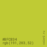 Цвет #BFCB34 в цветовой модели RGB обозначается тремя октетами (191, 203, 52) в десятичном формате и #BFCB34 в шестнадцатиричном (hex) формате, которые являются интенсивностью красного 191 (hex BF), интенсивность зелёного 203 (hex CB) и интенсивность синего 52 (hex 34).