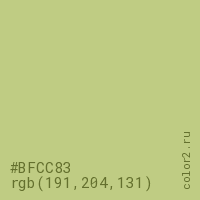 Цвет #BFCC83 в цветовой модели RGB обозначается тремя октетами (191, 204, 131) в десятичном формате и #BFCC83 в шестнадцатиричном (hex) формате, которые являются интенсивностью красного 191 (hex BF), интенсивность зелёного 204 (hex CC) и интенсивность синего 131 (hex 83).