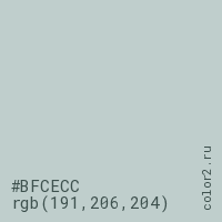 Цвет #BFCECC в цветовой модели RGB обозначается тремя октетами (191, 206, 204) в десятичном формате и #BFCECC в шестнадцатиричном (hex) формате, которые являются интенсивностью красного 191 (hex BF), интенсивность зелёного 206 (hex CE) и интенсивность синего 204 (hex CC).