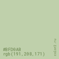 Цвет #BFD0AB в цветовой модели RGB обозначается тремя октетами (191, 208, 171) в десятичном формате и #BFD0AB в шестнадцатиричном (hex) формате, которые являются интенсивностью красного 191 (hex BF), интенсивность зелёного 208 (hex D0) и интенсивность синего 171 (hex AB).