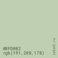 Цвет #BFD0B2 в цветовой модели RGB обозначается тремя октетами (191, 208, 178) в десятичном формате и #BFD0B2 в шестнадцатиричном (hex) формате, которые являются интенсивностью красного 191 (hex BF), интенсивность зелёного 208 (hex D0) и интенсивность синего 178 (hex B2).