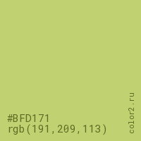 Цвет #BFD171 в цветовой модели RGB обозначается тремя октетами (191, 209, 113) в десятичном формате и #BFD171 в шестнадцатиричном (hex) формате, которые являются интенсивностью красного 191 (hex BF), интенсивность зелёного 209 (hex D1) и интенсивность синего 113 (hex 71).