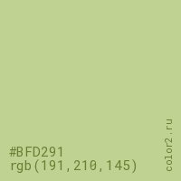 Цвет #BFD291 в цветовой модели RGB обозначается тремя октетами (191, 210, 145) в десятичном формате и #BFD291 в шестнадцатиричном (hex) формате, которые являются интенсивностью красного 191 (hex BF), интенсивность зелёного 210 (hex D2) и интенсивность синего 145 (hex 91).