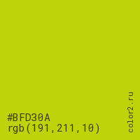 Цвет #BFD30A в цветовой модели RGB обозначается тремя октетами (191, 211, 10) в десятичном формате и #BFD30A в шестнадцатиричном (hex) формате, которые являются интенсивностью красного 191 (hex BF), интенсивность зелёного 211 (hex D3) и интенсивность синего 10 (hex 0A).