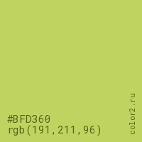 Цвет #BFD360 в цветовой модели RGB обозначается тремя октетами (191, 211, 96) в десятичном формате и #BFD360 в шестнадцатиричном (hex) формате, которые являются интенсивностью красного 191 (hex BF), интенсивность зелёного 211 (hex D3) и интенсивность синего 96 (hex 60).