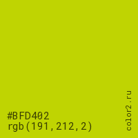 Цвет #BFD402 в цветовой модели RGB обозначается тремя октетами (191, 212, 2) в десятичном формате и #BFD402 в шестнадцатиричном (hex) формате, которые являются интенсивностью красного 191 (hex BF), интенсивность зелёного 212 (hex D4) и интенсивность синего 2 (hex 02).