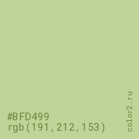 Цвет #BFD499 в цветовой модели RGB обозначается тремя октетами (191, 212, 153) в десятичном формате и #BFD499 в шестнадцатиричном (hex) формате, которые являются интенсивностью красного 191 (hex BF), интенсивность зелёного 212 (hex D4) и интенсивность синего 153 (hex 99).