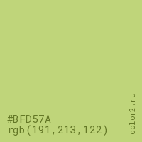 Цвет #BFD57A в цветовой модели RGB обозначается тремя октетами (191, 213, 122) в десятичном формате и #BFD57A в шестнадцатиричном (hex) формате, которые являются интенсивностью красного 191 (hex BF), интенсивность зелёного 213 (hex D5) и интенсивность синего 122 (hex 7A).