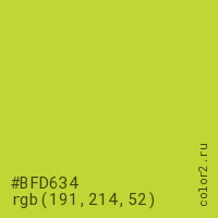 Цвет #BFD634 в цветовой модели RGB обозначается тремя октетами (191, 214, 52) в десятичном формате и #BFD634 в шестнадцатиричном (hex) формате, которые являются интенсивностью красного 191 (hex BF), интенсивность зелёного 214 (hex D6) и интенсивность синего 52 (hex 34).