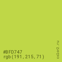 Цвет #BFD747 в цветовой модели RGB обозначается тремя октетами (191, 215, 71) в десятичном формате и #BFD747 в шестнадцатиричном (hex) формате, которые являются интенсивностью красного 191 (hex BF), интенсивность зелёного 215 (hex D7) и интенсивность синего 71 (hex 47).