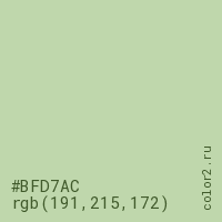 Цвет #BFD7AC в цветовой модели RGB обозначается тремя октетами (191, 215, 172) в десятичном формате и #BFD7AC в шестнадцатиричном (hex) формате, которые являются интенсивностью красного 191 (hex BF), интенсивность зелёного 215 (hex D7) и интенсивность синего 172 (hex AC).