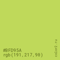 Цвет #BFD95A в цветовой модели RGB обозначается тремя октетами (191, 217, 90) в десятичном формате и #BFD95A в шестнадцатиричном (hex) формате, которые являются интенсивностью красного 191 (hex BF), интенсивность зелёного 217 (hex D9) и интенсивность синего 90 (hex 5A).