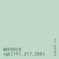 Цвет #BFD9C8 в цветовой модели RGB обозначается тремя октетами (191, 217, 200) в десятичном формате и #BFD9C8 в шестнадцатиричном (hex) формате, которые являются интенсивностью красного 191 (hex BF), интенсивность зелёного 217 (hex D9) и интенсивность синего 200 (hex C8).
