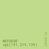 Цвет #BFDB8B в цветовой модели RGB обозначается тремя октетами (191, 219, 139) в десятичном формате и #BFDB8B в шестнадцатиричном (hex) формате, которые являются интенсивностью красного 191 (hex BF), интенсивность зелёного 219 (hex DB) и интенсивность синего 139 (hex 8B).