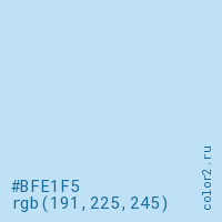 Цвет #BFE1F5 в цветовой модели RGB обозначается тремя октетами (191, 225, 245) в десятичном формате и #BFE1F5 в шестнадцатиричном (hex) формате, которые являются интенсивностью красного 191 (hex BF), интенсивность зелёного 225 (hex E1) и интенсивность синего 245 (hex F5).