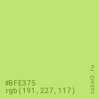 Цвет #BFE375 в цветовой модели RGB обозначается тремя октетами (191, 227, 117) в десятичном формате и #BFE375 в шестнадцатиричном (hex) формате, которые являются интенсивностью красного 191 (hex BF), интенсивность зелёного 227 (hex E3) и интенсивность синего 117 (hex 75).