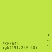 Цвет #BFE544 в цветовой модели RGB обозначается тремя октетами (191, 229, 68) в десятичном формате и #BFE544 в шестнадцатиричном (hex) формате, которые являются интенсивностью красного 191 (hex BF), интенсивность зелёного 229 (hex E5) и интенсивность синего 68 (hex 44).