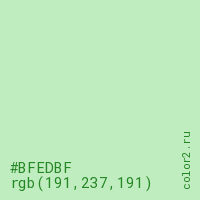 Цвет #BFEDBF в цветовой модели RGB обозначается тремя октетами (191, 237, 191) в десятичном формате и #BFEDBF в шестнадцатиричном (hex) формате, которые являются интенсивностью красного 191 (hex BF), интенсивность зелёного 237 (hex ED) и интенсивность синего 191 (hex BF).