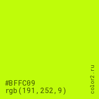 Цвет #BFFC09 в цветовой модели RGB обозначается тремя октетами (191, 252, 9) в десятичном формате и #BFFC09 в шестнадцатиричном (hex) формате, которые являются интенсивностью красного 191 (hex BF), интенсивность зелёного 252 (hex FC) и интенсивность синего 9 (hex 09).