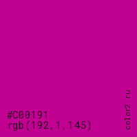 Цвет #C00191 в цветовой модели RGB обозначается тремя октетами (192, 1, 145) в десятичном формате и #C00191 в шестнадцатиричном (hex) формате, которые являются интенсивностью красного 192 (hex C0), интенсивность зелёного 1 (hex 01) и интенсивность синего 145 (hex 91).