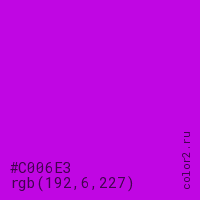 Цвет #C006E3 в цветовой модели RGB обозначается тремя октетами (192, 6, 227) в десятичном формате и #C006E3 в шестнадцатиричном (hex) формате, которые являются интенсивностью красного 192 (hex C0), интенсивность зелёного 6 (hex 06) и интенсивность синего 227 (hex E3).
