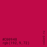 Цвет #C00948 в цветовой модели RGB обозначается тремя октетами (192, 9, 72) в десятичном формате и #C00948 в шестнадцатиричном (hex) формате, которые являются интенсивностью красного 192 (hex C0), интенсивность зелёного 9 (hex 09) и интенсивность синего 72 (hex 48).