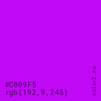 Цвет #C009F5 в цветовой модели RGB обозначается тремя октетами (192, 9, 245) в десятичном формате и #C009F5 в шестнадцатиричном (hex) формате, которые являются интенсивностью красного 192 (hex C0), интенсивность зелёного 9 (hex 09) и интенсивность синего 245 (hex F5).