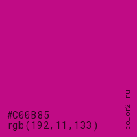 Цвет #C00B85 в цветовой модели RGB обозначается тремя октетами (192, 11, 133) в десятичном формате и #C00B85 в шестнадцатиричном (hex) формате, которые являются интенсивностью красного 192 (hex C0), интенсивность зелёного 11 (hex 0B) и интенсивность синего 133 (hex 85).