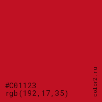 Цвет #C01123 в цветовой модели RGB обозначается тремя октетами (192, 17, 35) в десятичном формате и #C01123 в шестнадцатиричном (hex) формате, которые являются интенсивностью красного 192 (hex C0), интенсивность зелёного 17 (hex 11) и интенсивность синего 35 (hex 23).