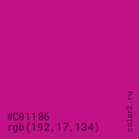 Цвет #C01186 в цветовой модели RGB обозначается тремя октетами (192, 17, 134) в десятичном формате и #C01186 в шестнадцатиричном (hex) формате, которые являются интенсивностью красного 192 (hex C0), интенсивность зелёного 17 (hex 11) и интенсивность синего 134 (hex 86).