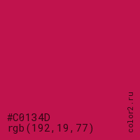 Цвет #C0134D в цветовой модели RGB обозначается тремя октетами (192, 19, 77) в десятичном формате и #C0134D в шестнадцатиричном (hex) формате, которые являются интенсивностью красного 192 (hex C0), интенсивность зелёного 19 (hex 13) и интенсивность синего 77 (hex 4D).