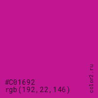 Цвет #C01692 в цветовой модели RGB обозначается тремя октетами (192, 22, 146) в десятичном формате и #C01692 в шестнадцатиричном (hex) формате, которые являются интенсивностью красного 192 (hex C0), интенсивность зелёного 22 (hex 16) и интенсивность синего 146 (hex 92).