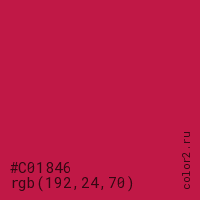 Цвет #C01846 в цветовой модели RGB обозначается тремя октетами (192, 24, 70) в десятичном формате и #C01846 в шестнадцатиричном (hex) формате, которые являются интенсивностью красного 192 (hex C0), интенсивность зелёного 24 (hex 18) и интенсивность синего 70 (hex 46).