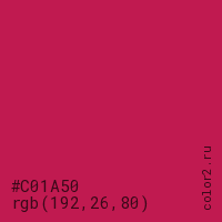 Цвет #C01A50 в цветовой модели RGB обозначается тремя октетами (192, 26, 80) в десятичном формате и #C01A50 в шестнадцатиричном (hex) формате, которые являются интенсивностью красного 192 (hex C0), интенсивность зелёного 26 (hex 1A) и интенсивность синего 80 (hex 50).