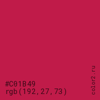 Цвет #C01B49 в цветовой модели RGB обозначается тремя октетами (192, 27, 73) в десятичном формате и #C01B49 в шестнадцатиричном (hex) формате, которые являются интенсивностью красного 192 (hex C0), интенсивность зелёного 27 (hex 1B) и интенсивность синего 73 (hex 49).