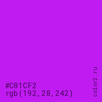 Цвет #C01CF2 в цветовой модели RGB обозначается тремя октетами (192, 28, 242) в десятичном формате и #C01CF2 в шестнадцатиричном (hex) формате, которые являются интенсивностью красного 192 (hex C0), интенсивность зелёного 28 (hex 1C) и интенсивность синего 242 (hex F2).