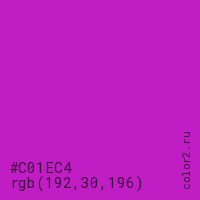 Цвет #C01EC4 в цветовой модели RGB обозначается тремя октетами (192, 30, 196) в десятичном формате и #C01EC4 в шестнадцатиричном (hex) формате, которые являются интенсивностью красного 192 (hex C0), интенсивность зелёного 30 (hex 1E) и интенсивность синего 196 (hex C4).