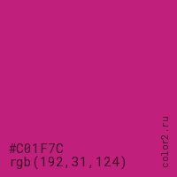 Цвет #C01F7C в цветовой модели RGB обозначается тремя октетами (192, 31, 124) в десятичном формате и #C01F7C в шестнадцатиричном (hex) формате, которые являются интенсивностью красного 192 (hex C0), интенсивность зелёного 31 (hex 1F) и интенсивность синего 124 (hex 7C).