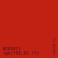 Цвет #C02011 в цветовой модели RGB обозначается тремя октетами (192, 32, 17) в десятичном формате и #C02011 в шестнадцатиричном (hex) формате, которые являются интенсивностью красного 192 (hex C0), интенсивность зелёного 32 (hex 20) и интенсивность синего 17 (hex 11).