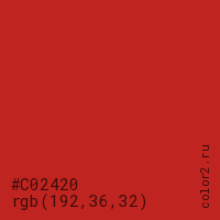 Цвет #C02420 в цветовой модели RGB обозначается тремя октетами (192, 36, 32) в десятичном формате и #C02420 в шестнадцатиричном (hex) формате, которые являются интенсивностью красного 192 (hex C0), интенсивность зелёного 36 (hex 24) и интенсивность синего 32 (hex 20).