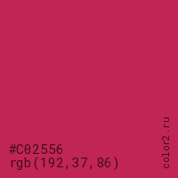 Цвет #C02556 в цветовой модели RGB обозначается тремя октетами (192, 37, 86) в десятичном формате и #C02556 в шестнадцатиричном (hex) формате, которые являются интенсивностью красного 192 (hex C0), интенсивность зелёного 37 (hex 25) и интенсивность синего 86 (hex 56).