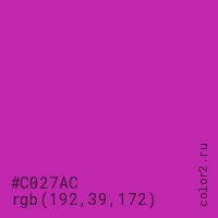 Цвет #C027AC в цветовой модели RGB обозначается тремя октетами (192, 39, 172) в десятичном формате и #C027AC в шестнадцатиричном (hex) формате, которые являются интенсивностью красного 192 (hex C0), интенсивность зелёного 39 (hex 27) и интенсивность синего 172 (hex AC).