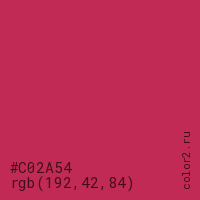 Цвет #C02A54 в цветовой модели RGB обозначается тремя октетами (192, 42, 84) в десятичном формате и #C02A54 в шестнадцатиричном (hex) формате, которые являются интенсивностью красного 192 (hex C0), интенсивность зелёного 42 (hex 2A) и интенсивность синего 84 (hex 54).