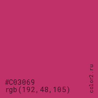 Цвет #C03069 в цветовой модели RGB обозначается тремя октетами (192, 48, 105) в десятичном формате и #C03069 в шестнадцатиричном (hex) формате, которые являются интенсивностью красного 192 (hex C0), интенсивность зелёного 48 (hex 30) и интенсивность синего 105 (hex 69).