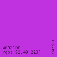 Цвет #C031DF в цветовой модели RGB обозначается тремя октетами (192, 49, 223) в десятичном формате и #C031DF в шестнадцатиричном (hex) формате, которые являются интенсивностью красного 192 (hex C0), интенсивность зелёного 49 (hex 31) и интенсивность синего 223 (hex DF).