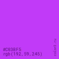 Цвет #C03BF5 в цветовой модели RGB обозначается тремя октетами (192, 59, 245) в десятичном формате и #C03BF5 в шестнадцатиричном (hex) формате, которые являются интенсивностью красного 192 (hex C0), интенсивность зелёного 59 (hex 3B) и интенсивность синего 245 (hex F5).
