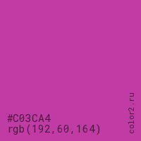 Цвет #C03CA4 в цветовой модели RGB обозначается тремя октетами (192, 60, 164) в десятичном формате и #C03CA4 в шестнадцатиричном (hex) формате, которые являются интенсивностью красного 192 (hex C0), интенсивность зелёного 60 (hex 3C) и интенсивность синего 164 (hex A4).