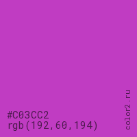 Цвет #C03CC2 в цветовой модели RGB обозначается тремя октетами (192, 60, 194) в десятичном формате и #C03CC2 в шестнадцатиричном (hex) формате, которые являются интенсивностью красного 192 (hex C0), интенсивность зелёного 60 (hex 3C) и интенсивность синего 194 (hex C2).